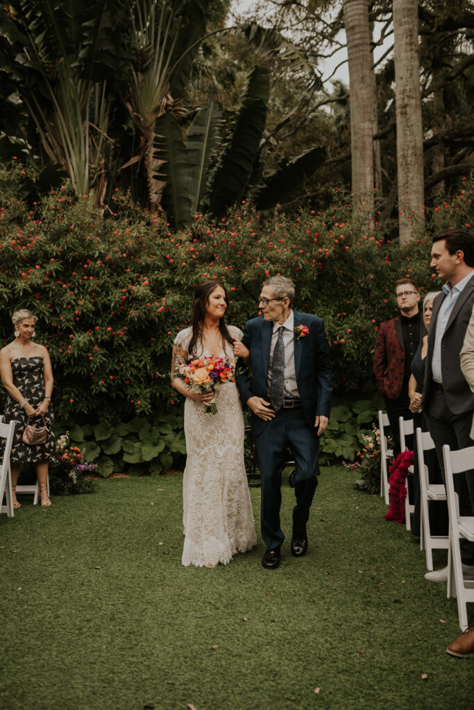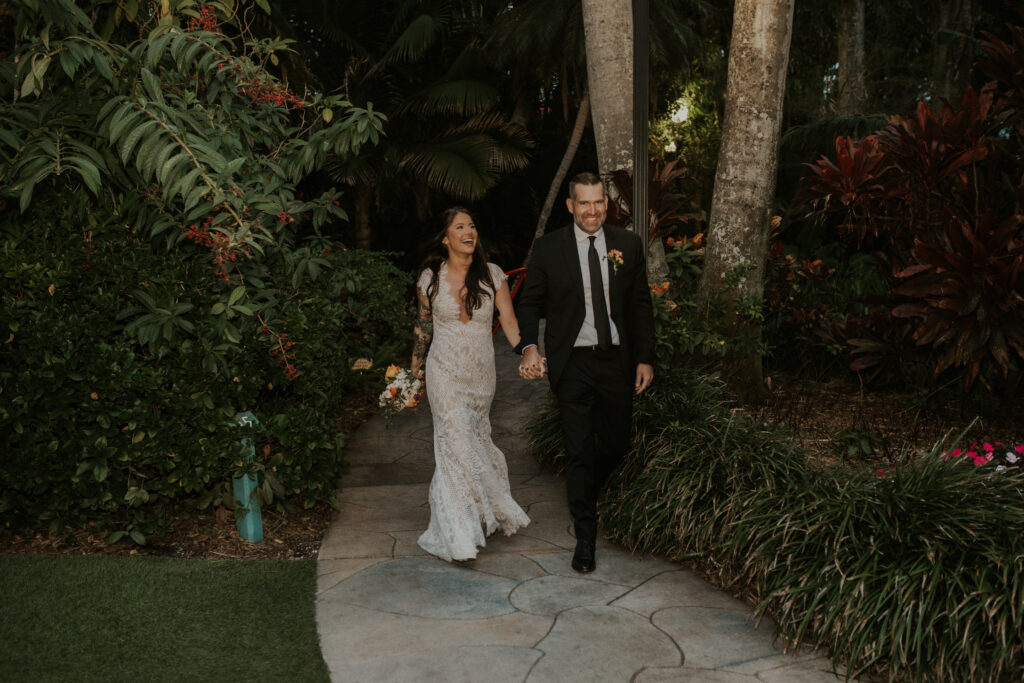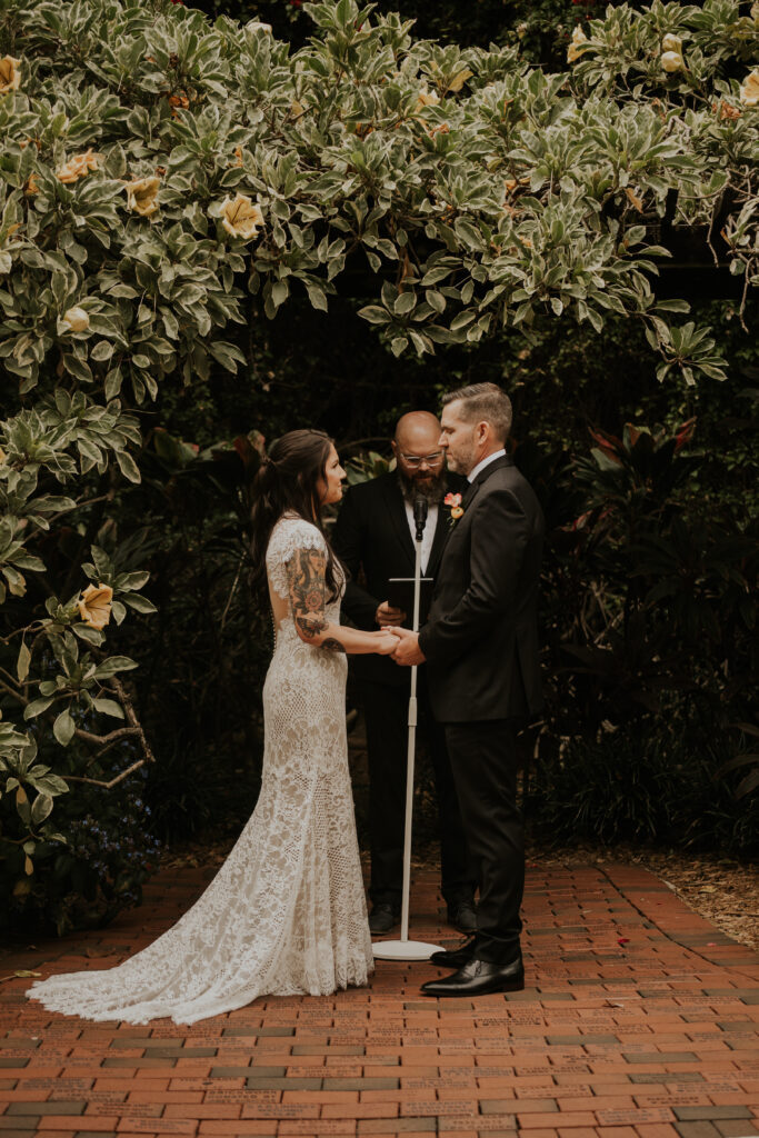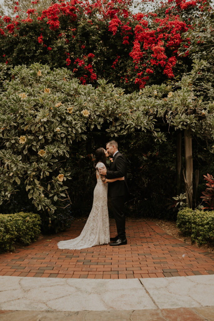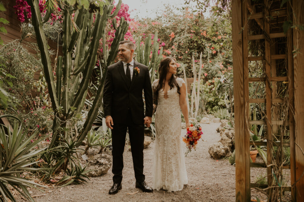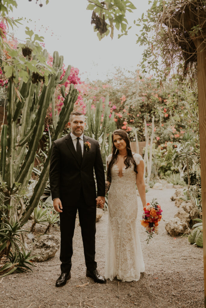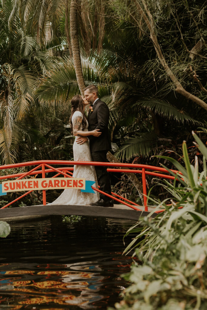 The day began under the towering palms and amidst the vibrant blooms of the Sunken Gardens. Renowned for its beauty and tranquility, this gorgeous venue offered an idyllic scene for Jessica and Chris as they exchanged their vows, perfectly encapsulating the essence of a garden wedding.