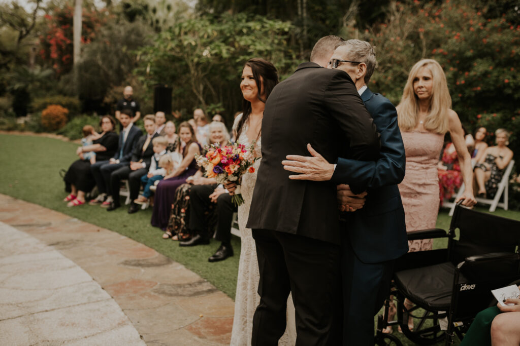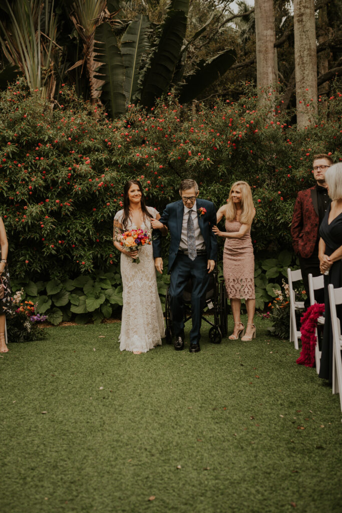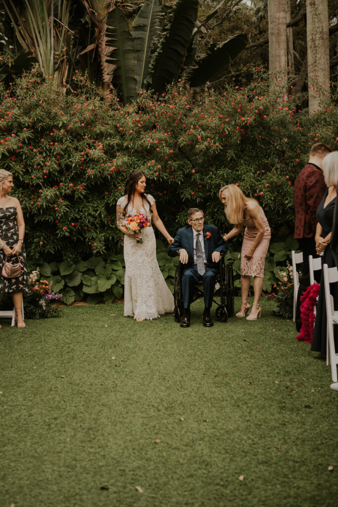 One of the most poignant moments at the wedding at the Sunken Gardens came when Jessica’s father, determined to share this significant walk, rose from his wheelchair to walk her down the aisle. This heart-touching gesture deeply moved all the guests, symbolizing strength, love, and commitment that resonated throughout the entire ceremony. Importantly, it served as a powerful reminder of the bonds and support within families, making this walk a highlight of the day.