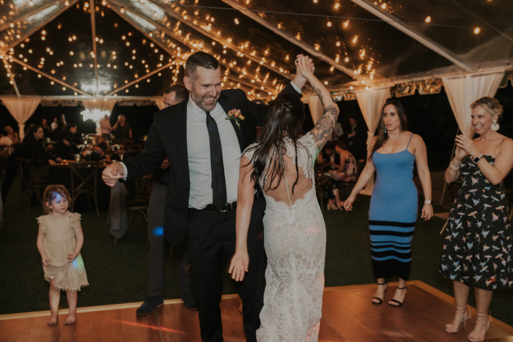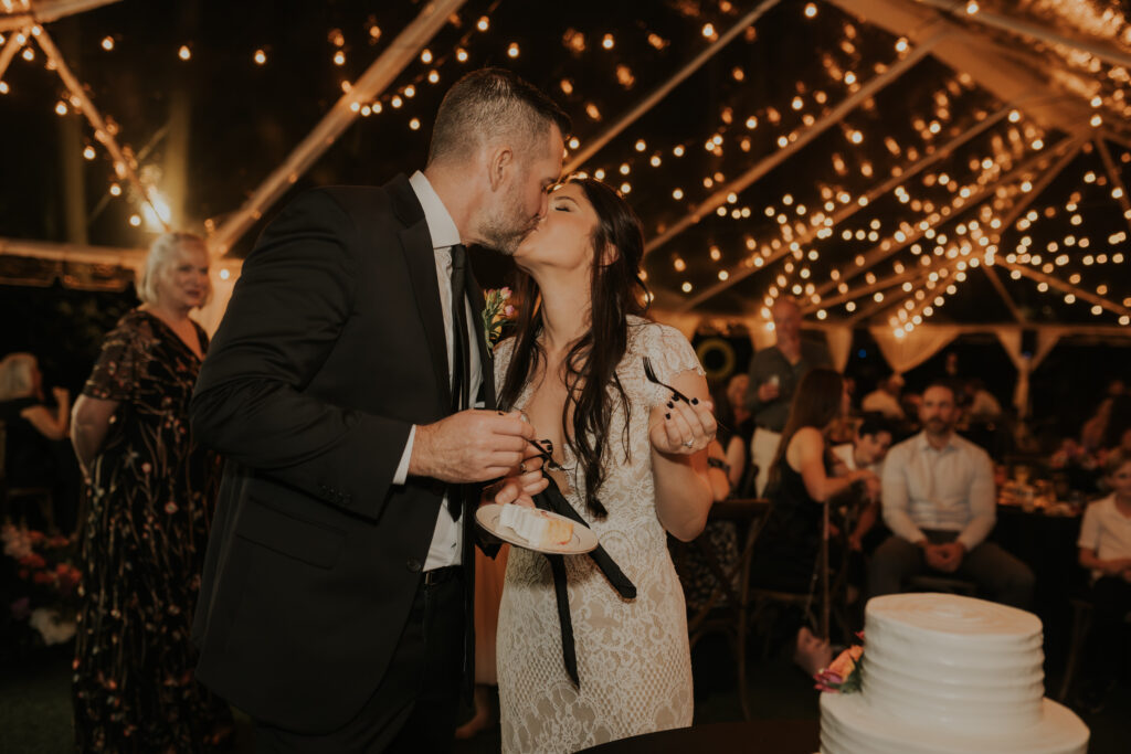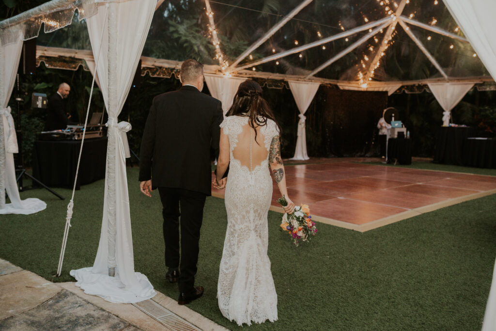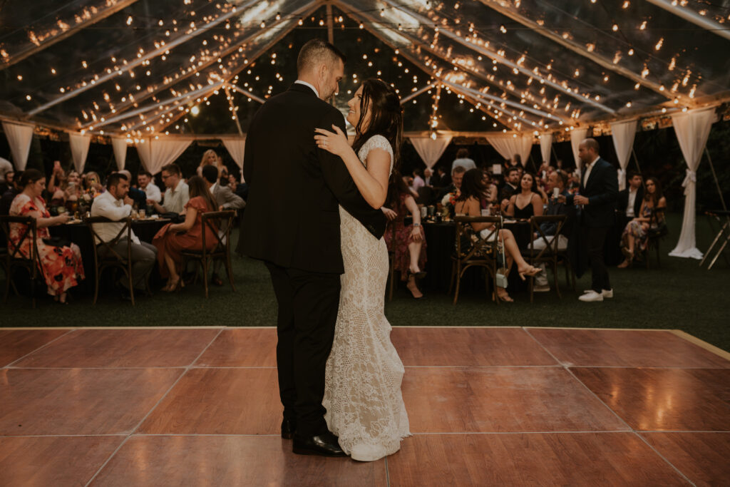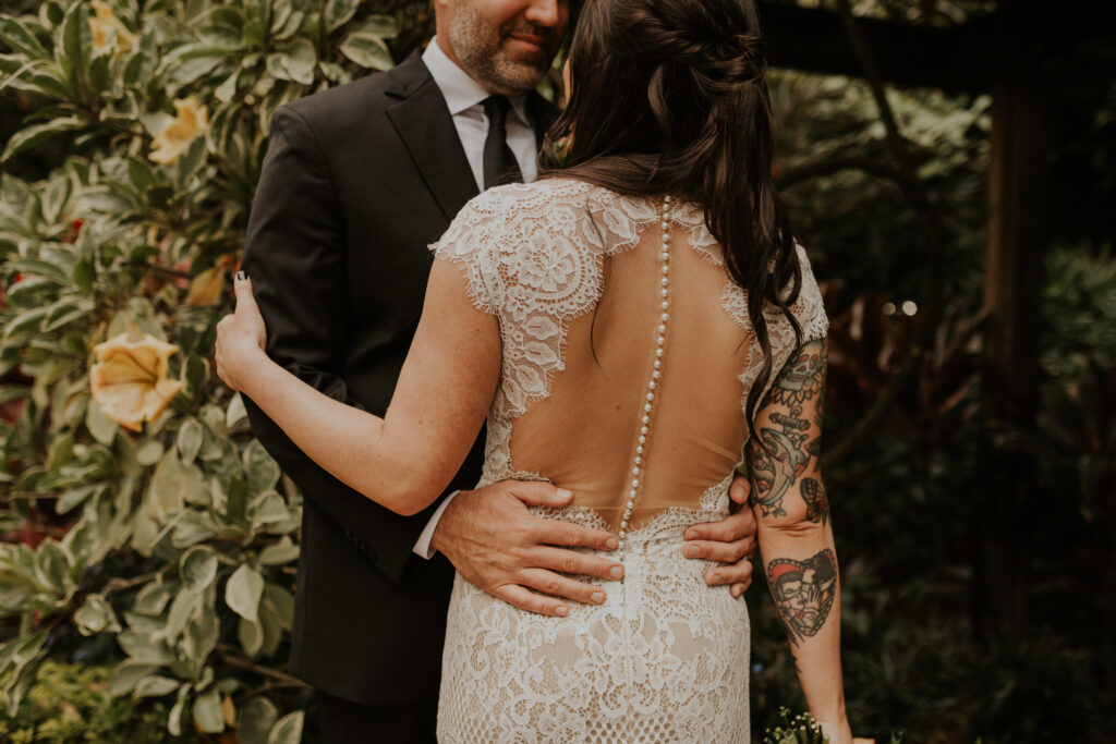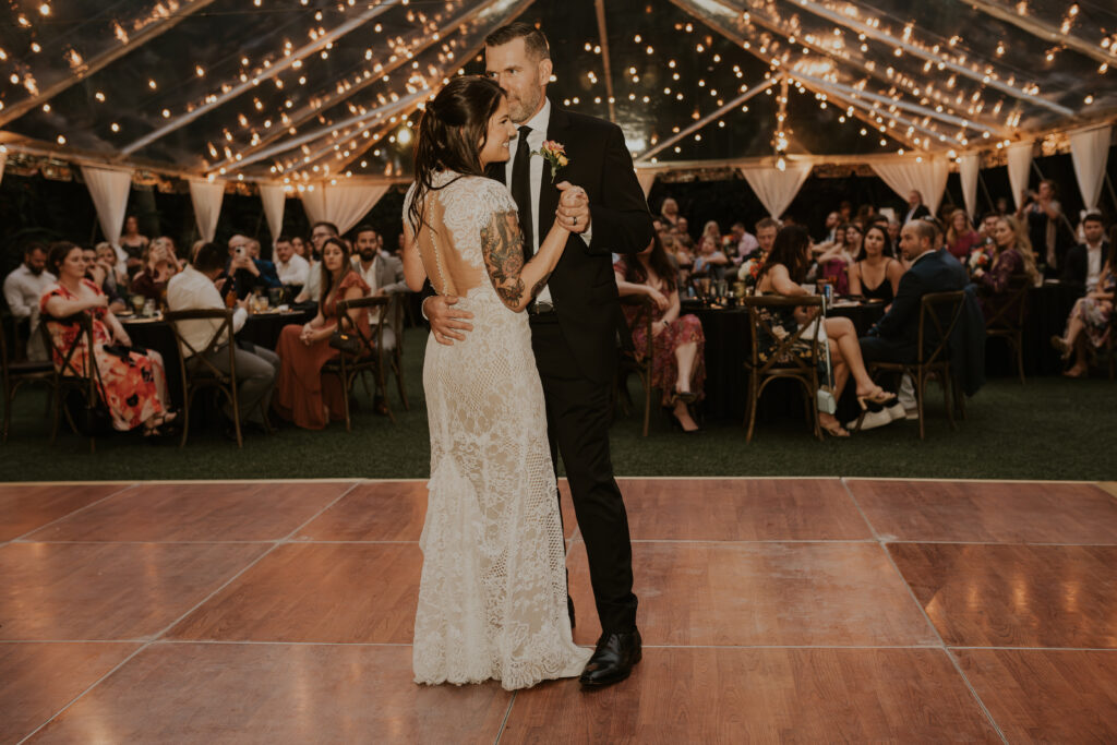 Furthermore, the reception, held within the same lush surroundings, continued the theme of intimacy and elegance. As the evening progressed, the gardens transformed under the glow of string lights, creating a magical atmosphere that enhanced the romantic setting. The couple and their guests danced the night away, surrounded by the natural beauty of the Sunken Gardens, celebrating the new chapter in Jessica and Chris’ lives.