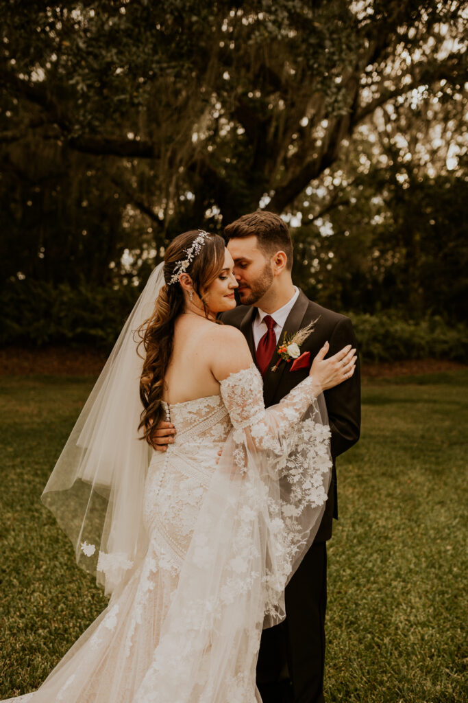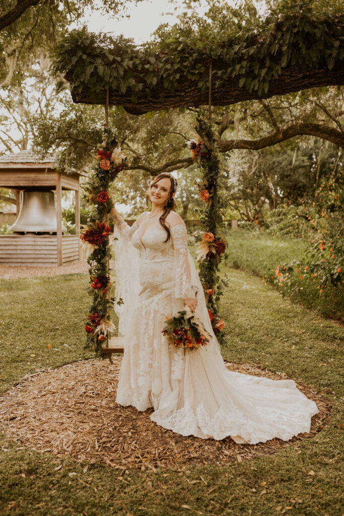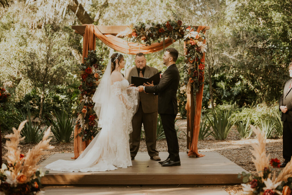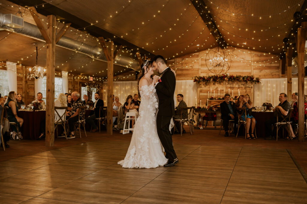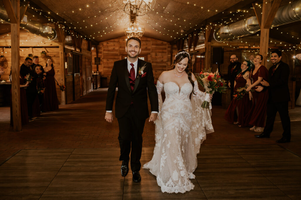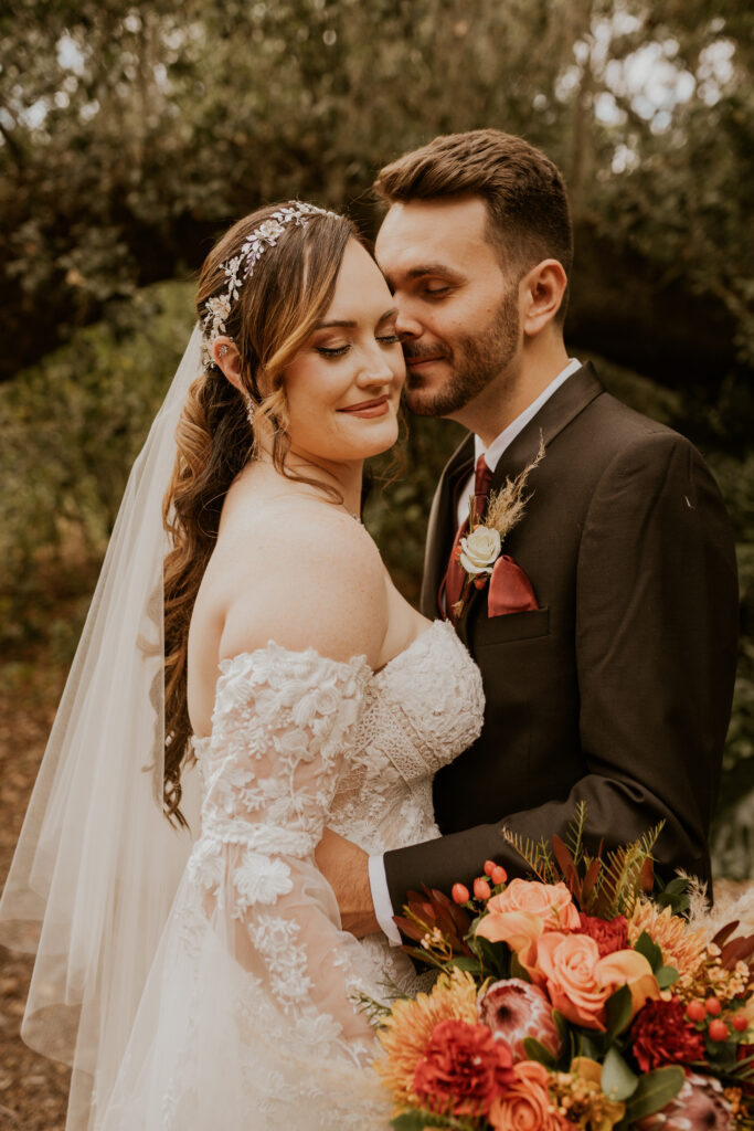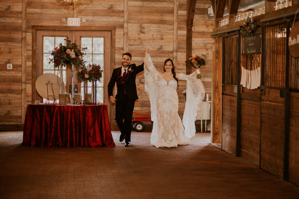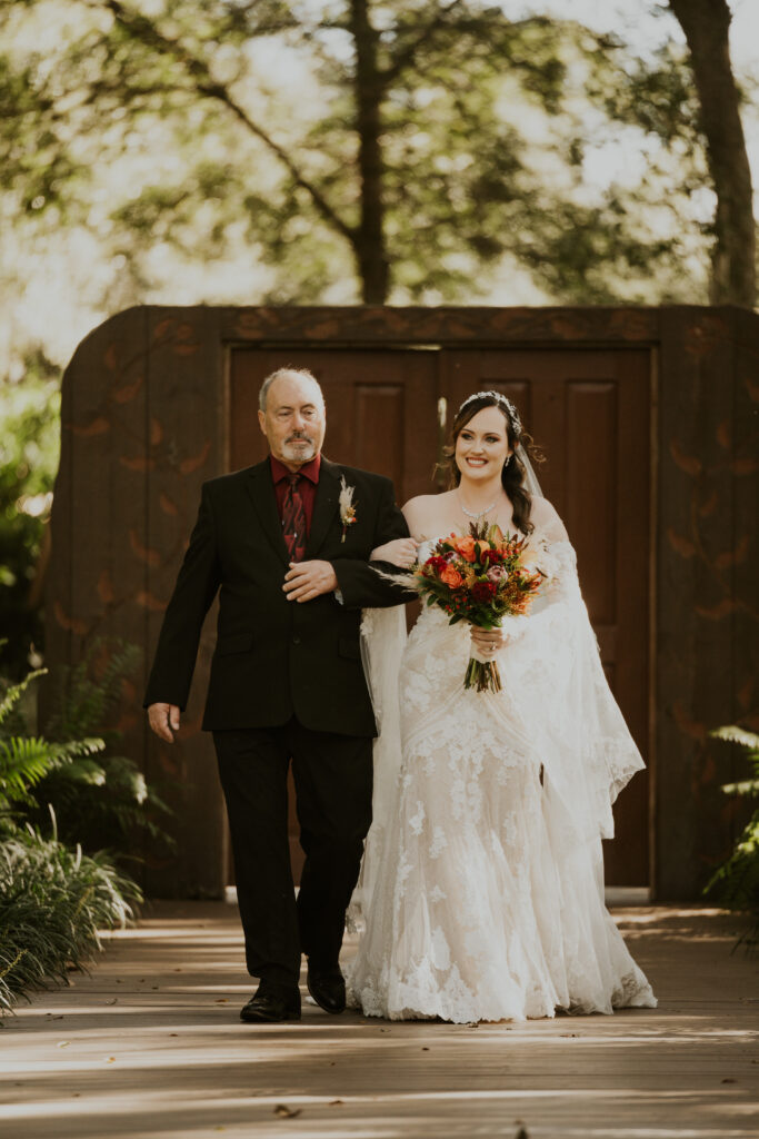 The decor was a spectacular showcase of the season, featuring beautiful fall colors that transformed Cross Creek Ranch into an elegant garden fairy-like setting. Breanne’s dress, along with the floral arrangements and other decorations, were thoughtfully chosen to reflect this theme, combining to create a stunningly picturesque environment. The rich hues of oranges, reds, and golds in the florals beautifully complemented the natural beauty of the venue, while elegant touches throughout the space enhanced the fairy-tale feel of their wedding.