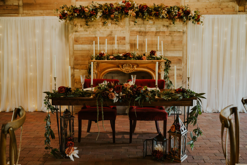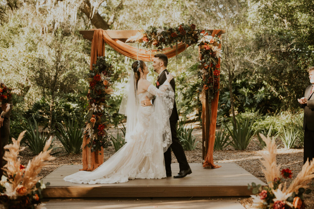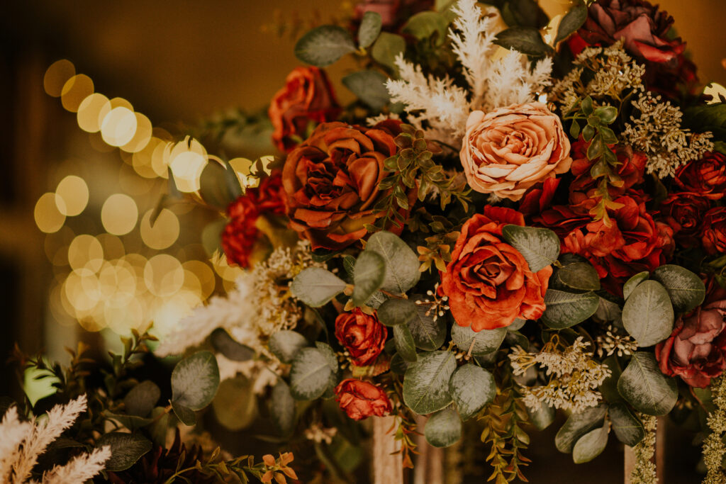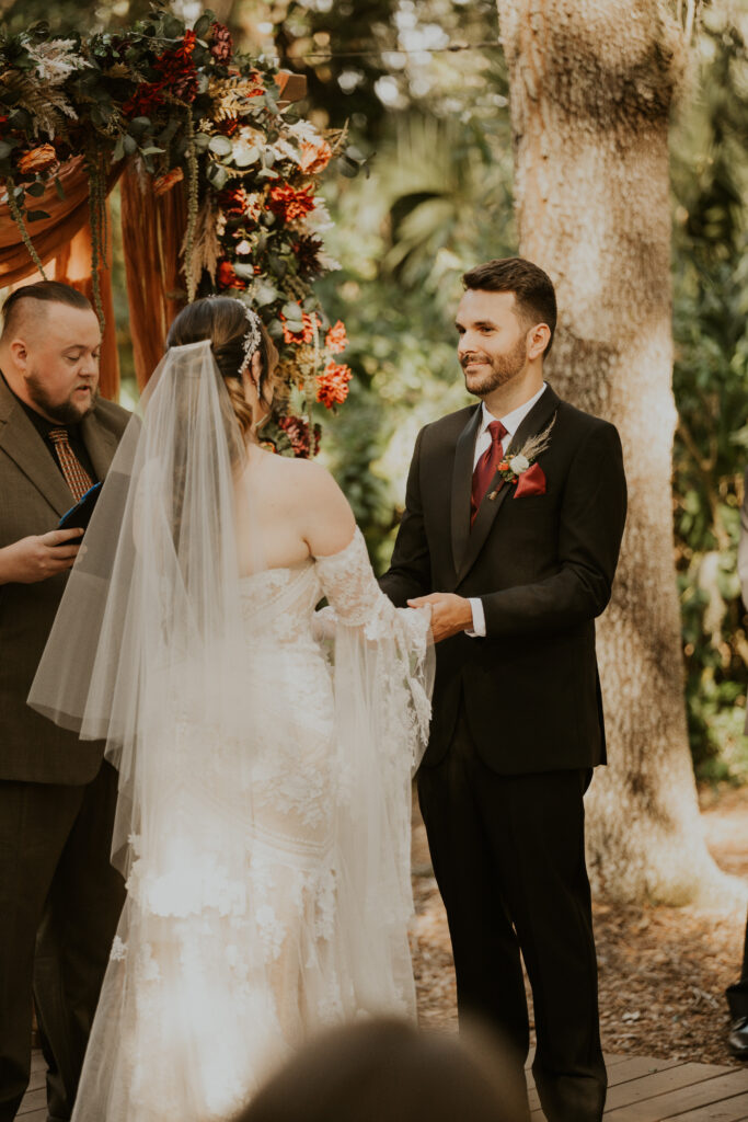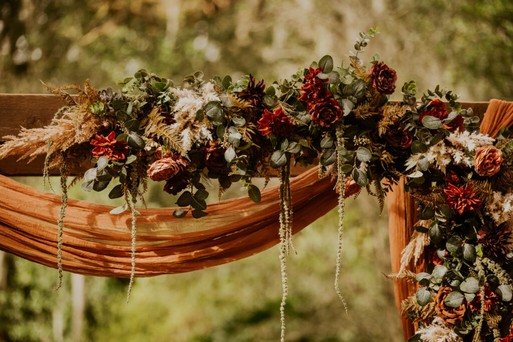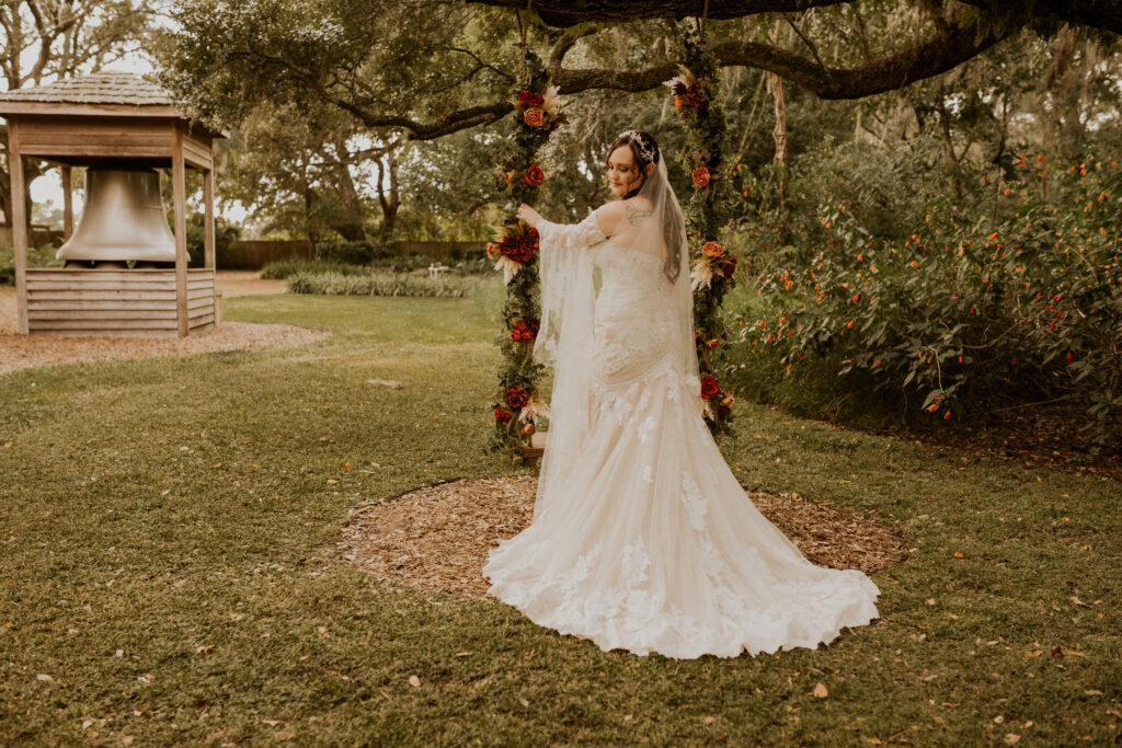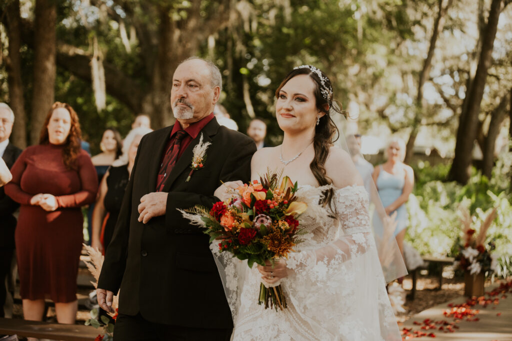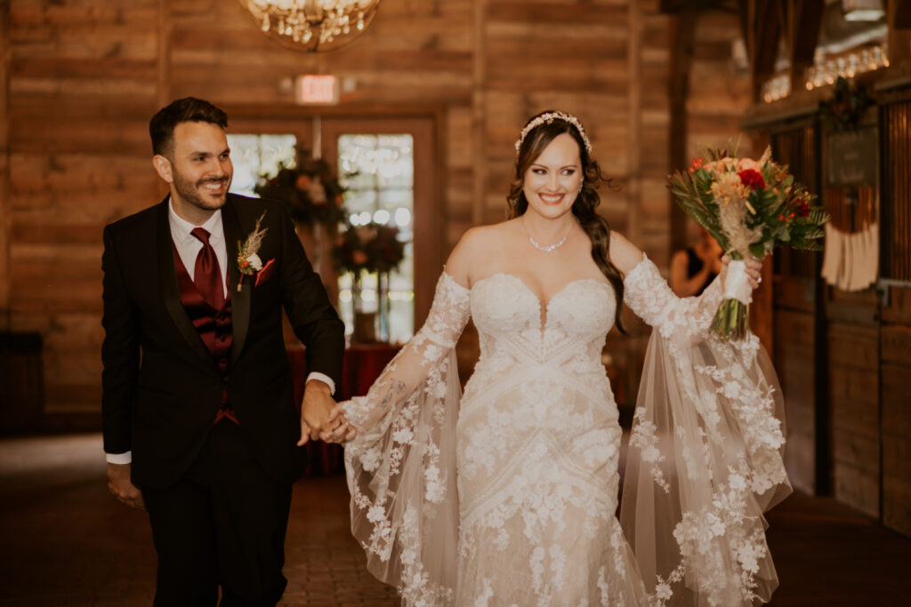 The decor was a spectacular showcase of the season, featuring beautiful fall colors that transformed Cross Creek Ranch into an elegant garden fairy-like setting. Breanne’s dress, along with the floral arrangements and other decorations, were thoughtfully chosen to reflect this theme, combining to create a stunningly picturesque environment. The rich hues of oranges, reds, and golds in the florals beautifully complemented the natural beauty of the venue, while elegant touches throughout the space enhanced the fairy-tale feel of their wedding.