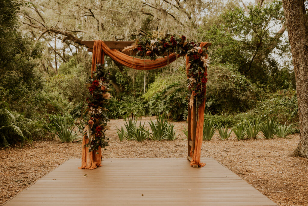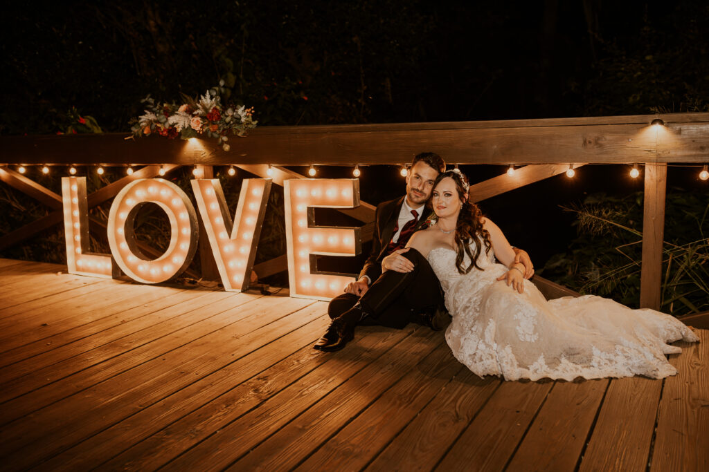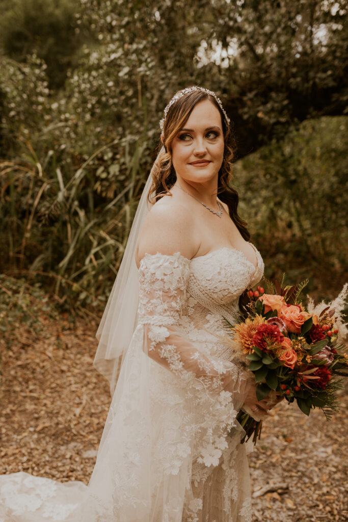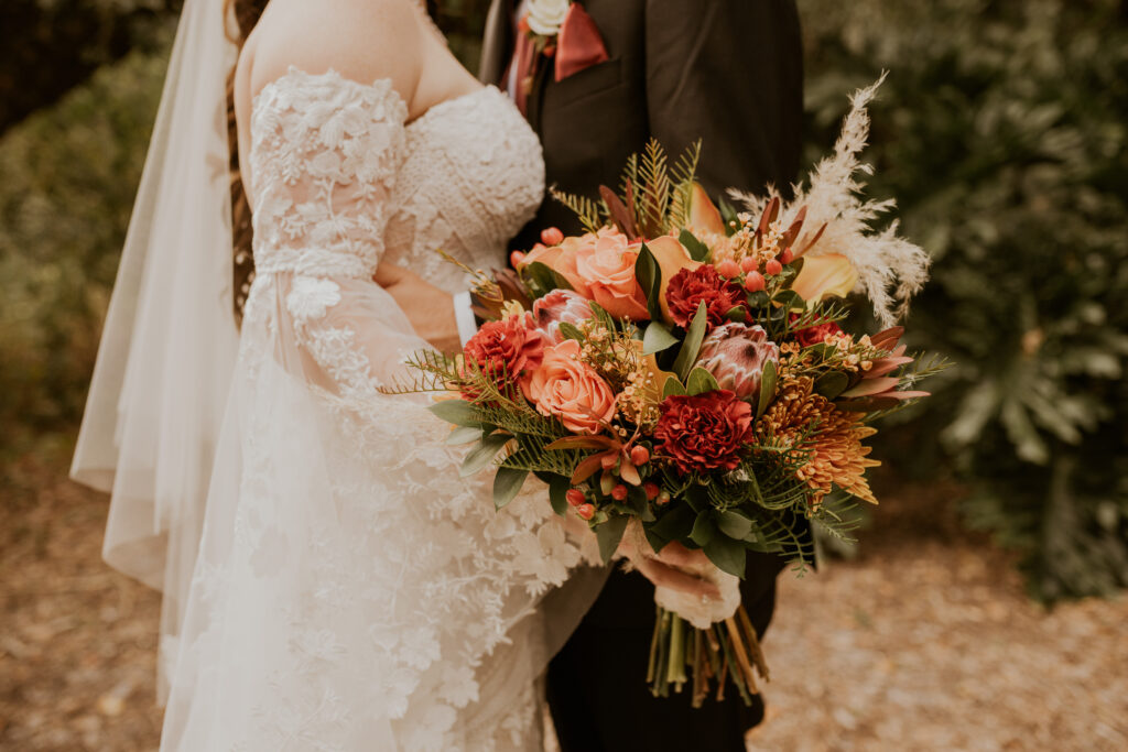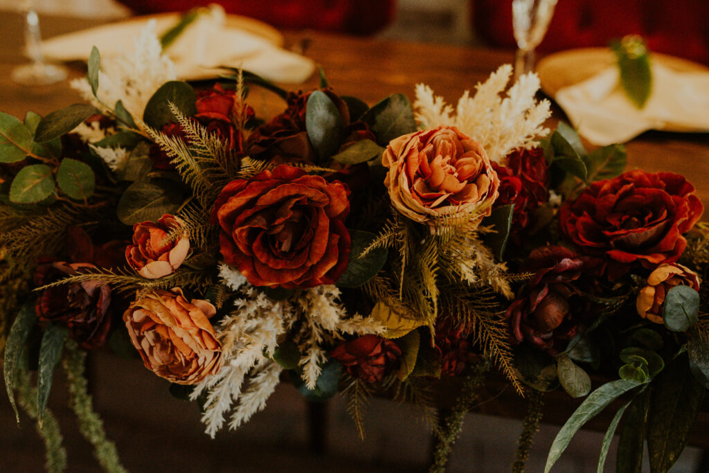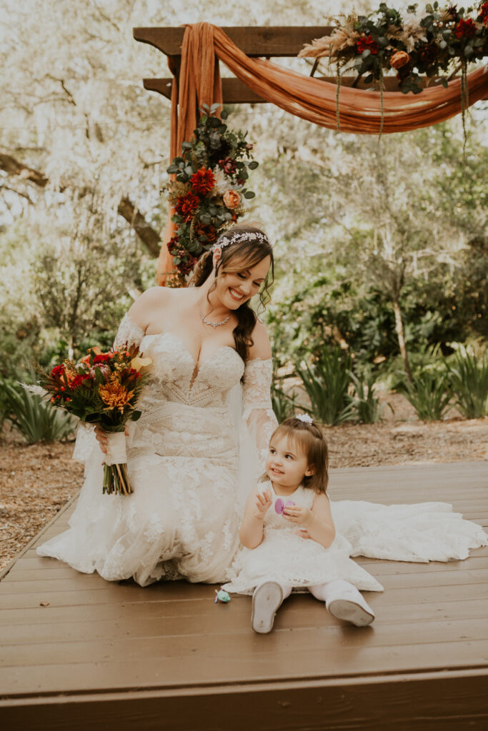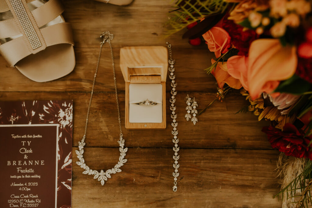 The decor was a spectacular showcase of the season, featuring beautiful fall colors that transformed Cross Creek Ranch into an elegant garden fairy-like setting. Breanne’s dress, along with the floral arrangements and other decorations, were thoughtfully chosen to reflect this theme, combining to create a stunningly picturesque environment. The rich hues of oranges, reds, and golds in the florals beautifully complemented the natural beauty of the venue, while elegant touches throughout the space enhanced the fairy-tale feel of their wedding.