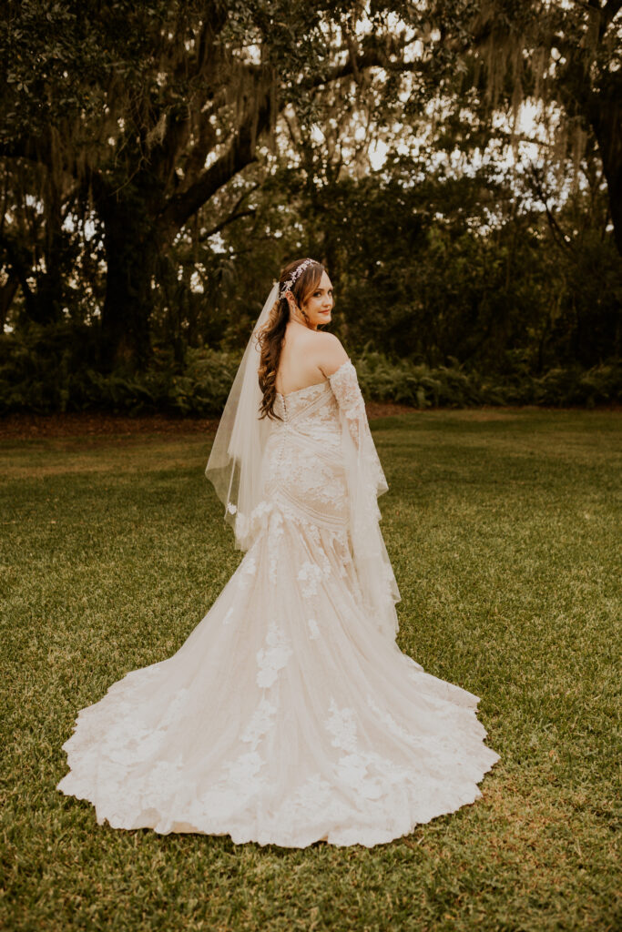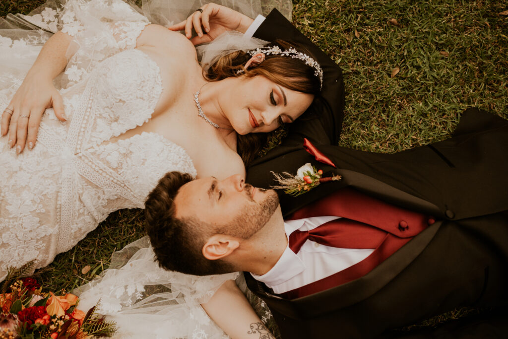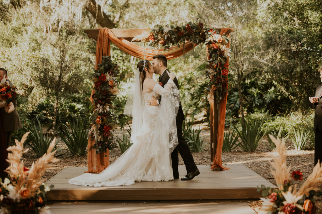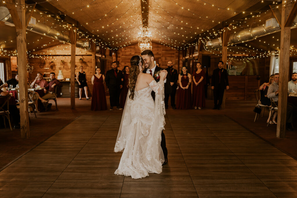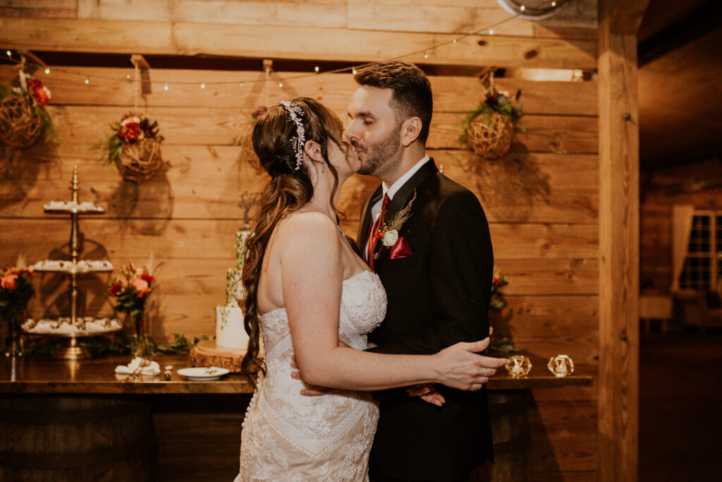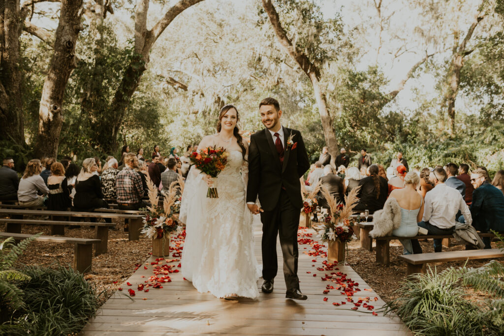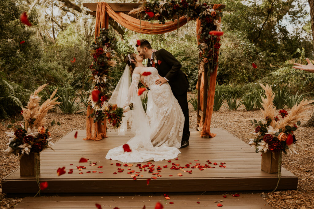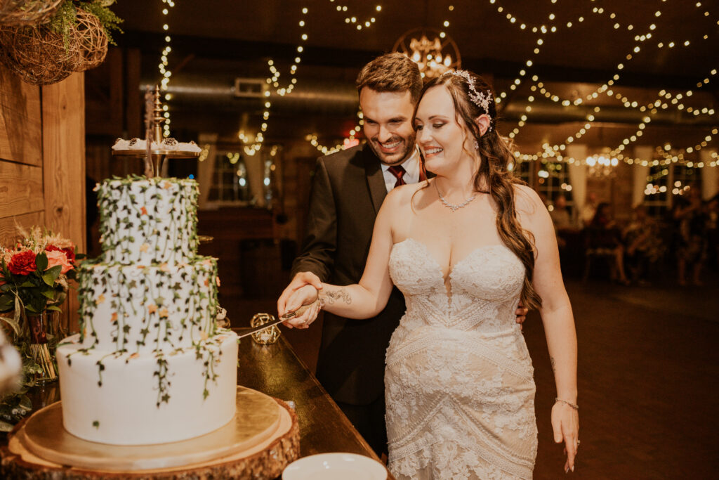 The decor was a spectacular showcase of the season, featuring beautiful fall colors that transformed Cross Creek Ranch into an elegant garden fairy-like setting. Breanne’s dress, along with the floral arrangements and other decorations, were thoughtfully chosen to reflect this theme, combining to create a stunningly picturesque environment. The rich hues of oranges, reds, and golds in the florals beautifully complemented the natural beauty of the venue, while elegant touches throughout the space enhanced the fairy-tale feel of their wedding.