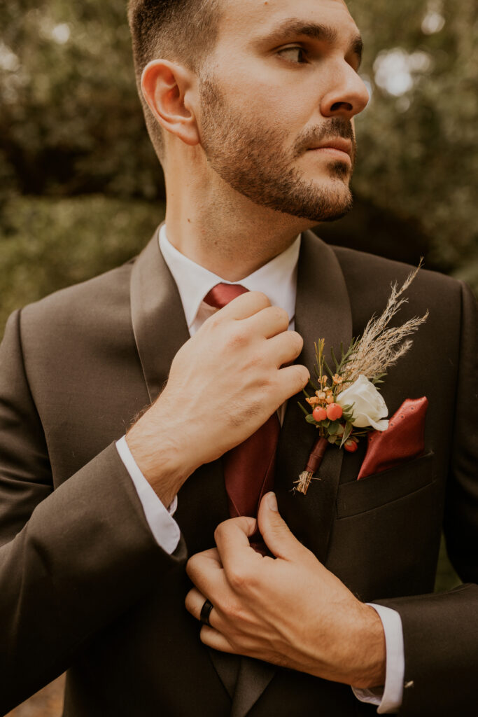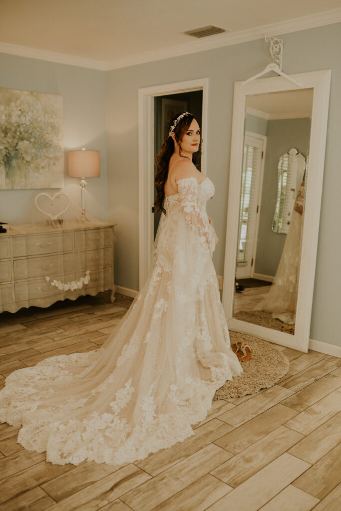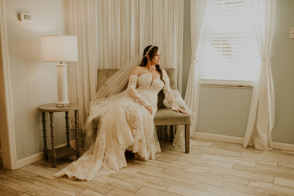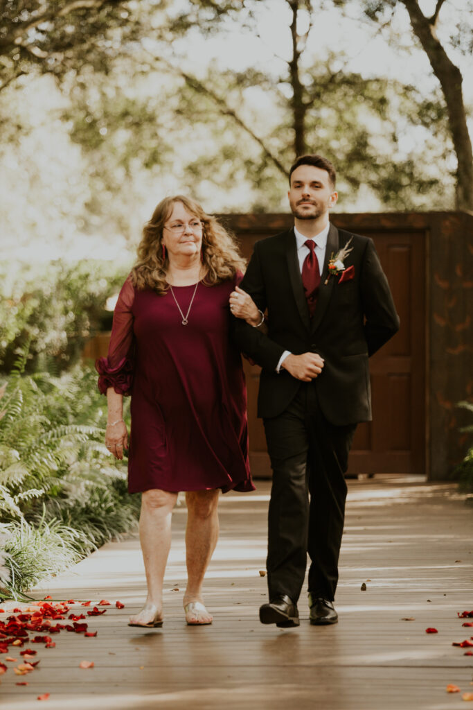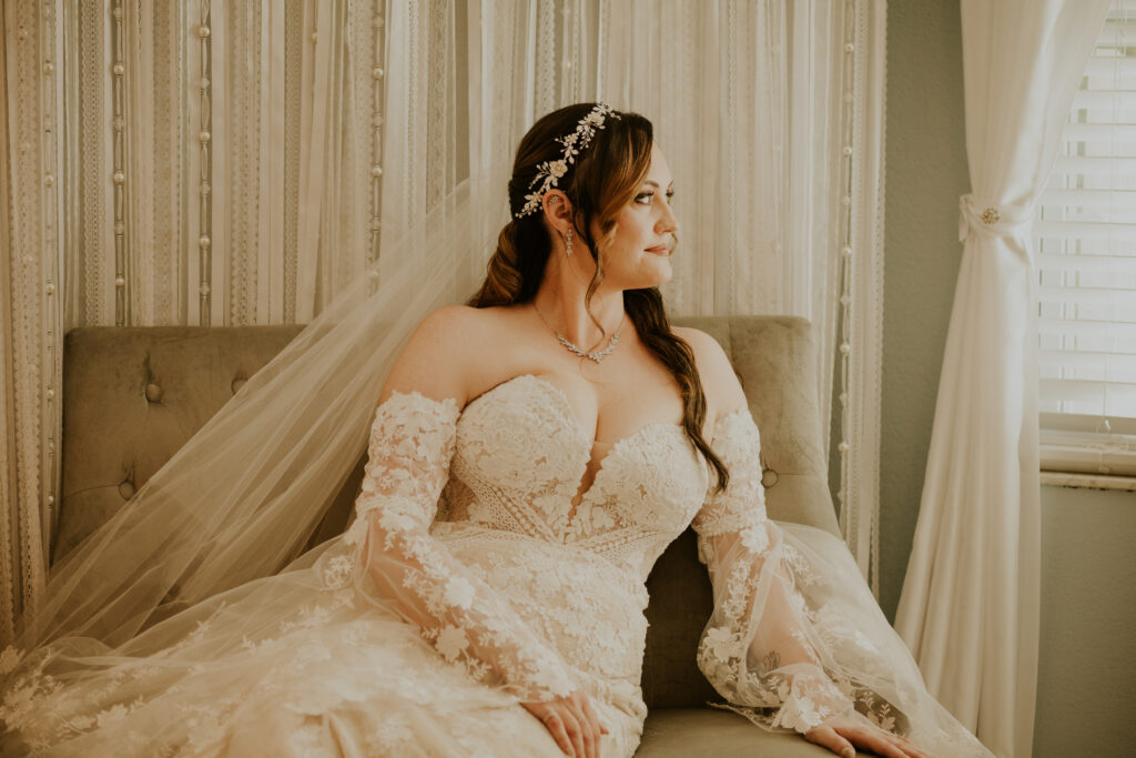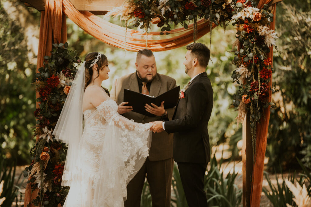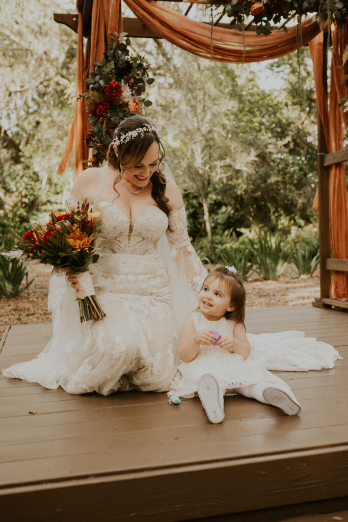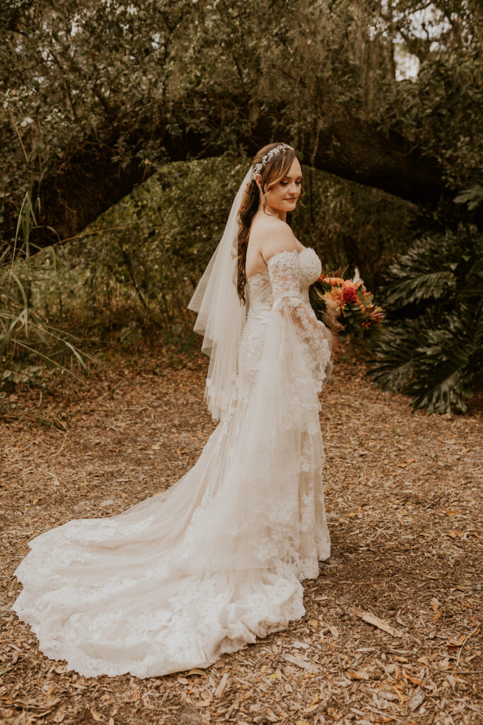 The decor was a spectacular showcase of the season, featuring beautiful fall colors that transformed Cross Creek Ranch into an elegant garden fairy-like setting. Breanne’s dress, along with the floral arrangements and other decorations, were thoughtfully chosen to reflect this theme, combining to create a stunningly picturesque environment. The rich hues of oranges, reds, and golds in the florals beautifully complemented the natural beauty of the venue, while elegant touches throughout the space enhanced the fairy-tale feel of their wedding.