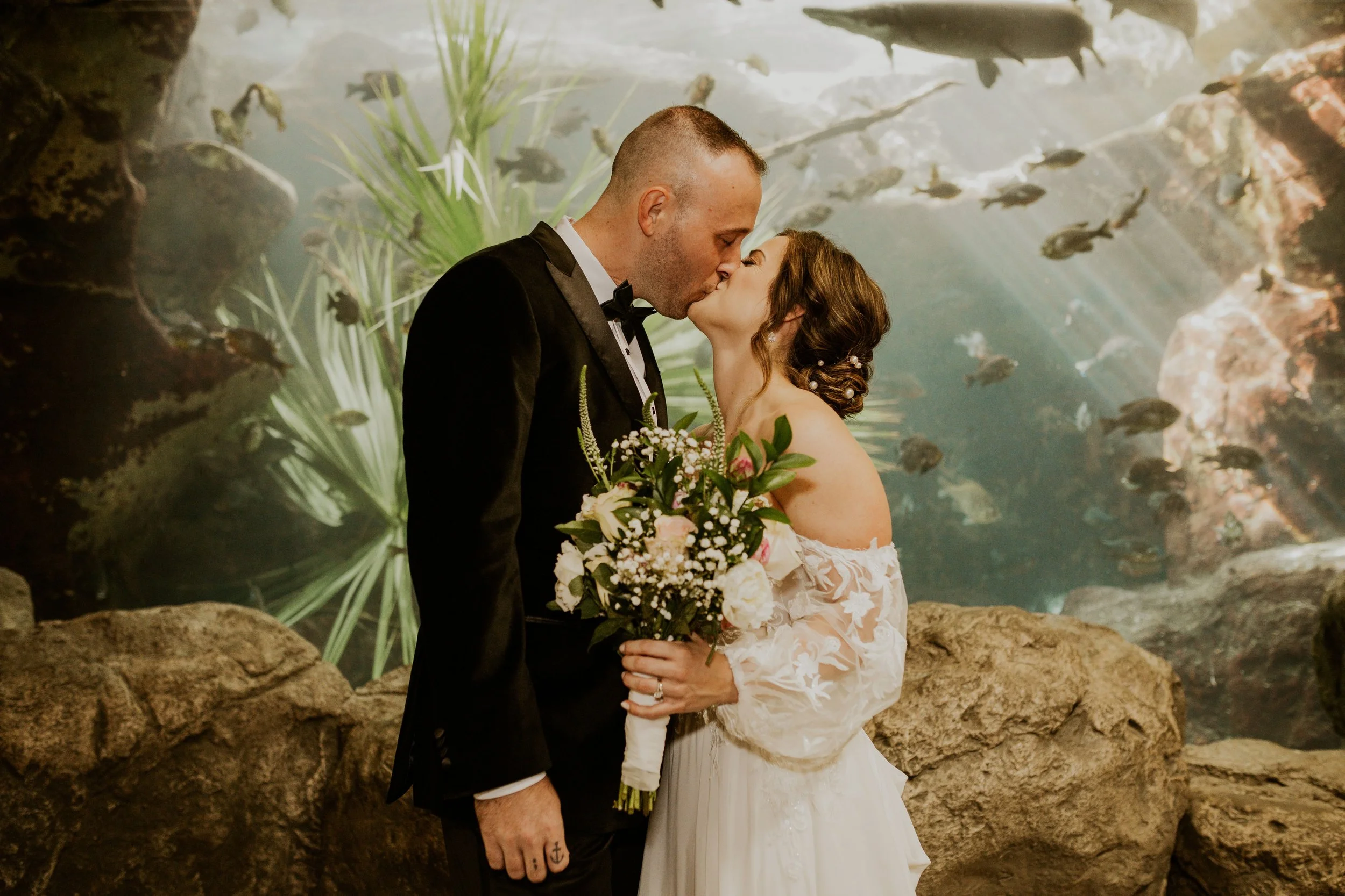 Jess and Colin’s wedding day is such a perfect example that your wedding doesn’t have to follow a traditional structure to be meaningful. By choosing a reception-focused celebration at the Florida Aquarium in Tampa, Florida, they created an experience that felt personal, interactive, and unforgettable. It was full of emotion, connection, and so much joy and being able to document it all in such a unique space made it even more special.