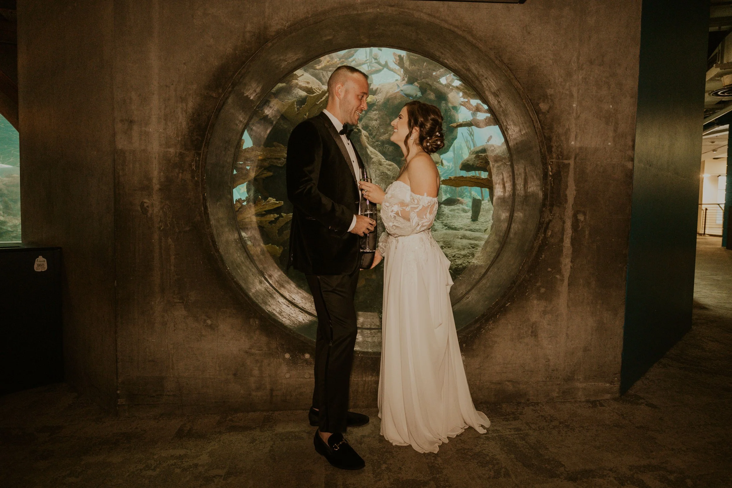 We took time throughout the night to step away for a few portraits, using the aquarium exhibits as their backdrop. The deep blues, the reflections, and the movement around them created such a dreamy, almost surreal feeling to their images. But more than anything, it was the way they interacted, relaxed, connected, and completely in their own world. No stiff posing, no pressure. Just real moments.